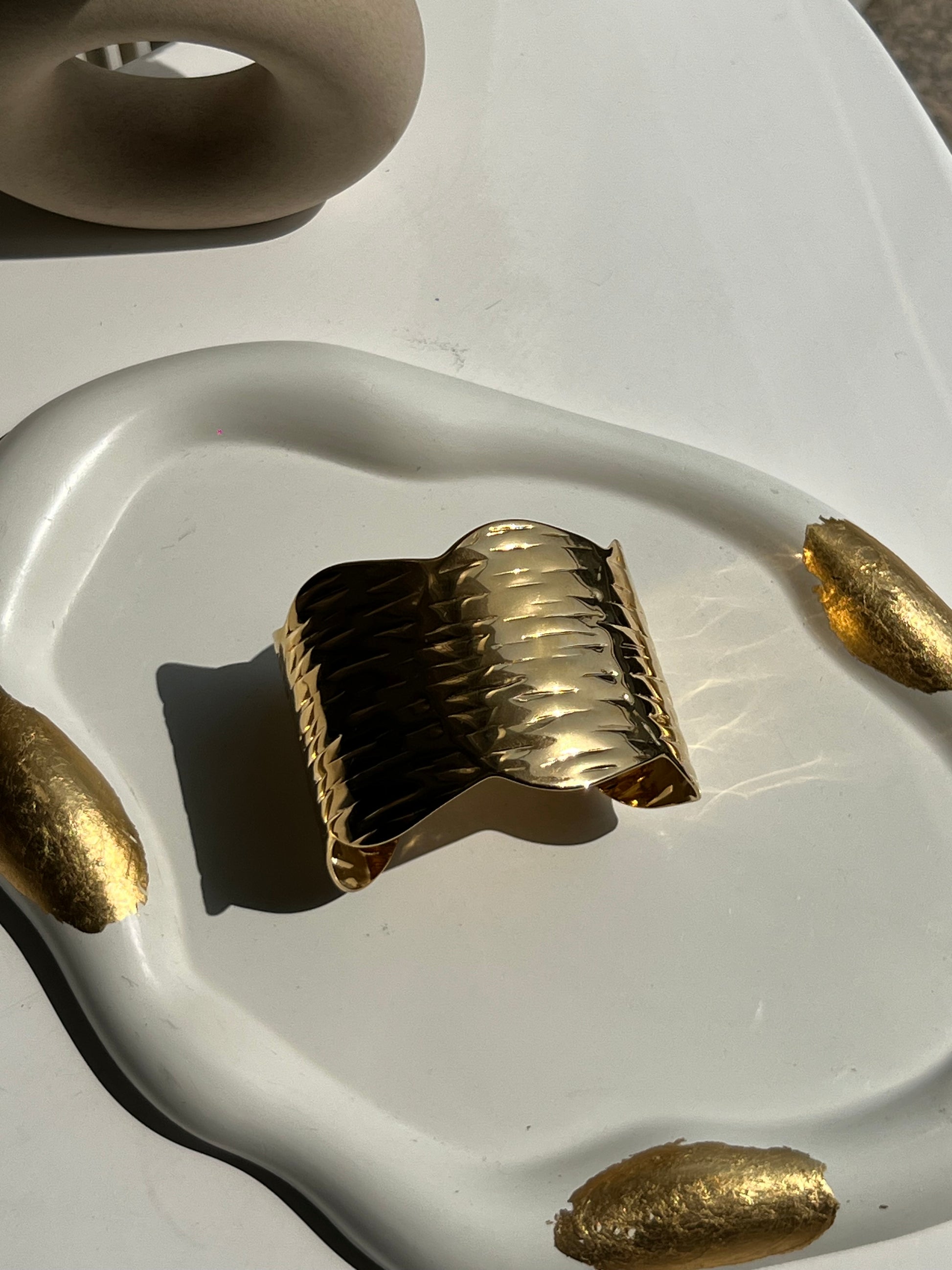 The Aurelian Cuff is a bold statement piece, featuring a rippled gold texture that catches the light from every angle. Its sculptural form blends elegance with strength, making it the perfect accessory for those who love striking, high-impact designs.