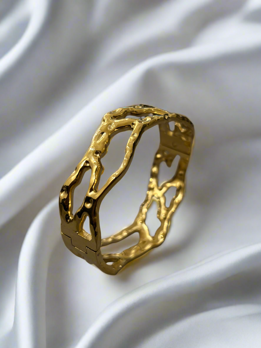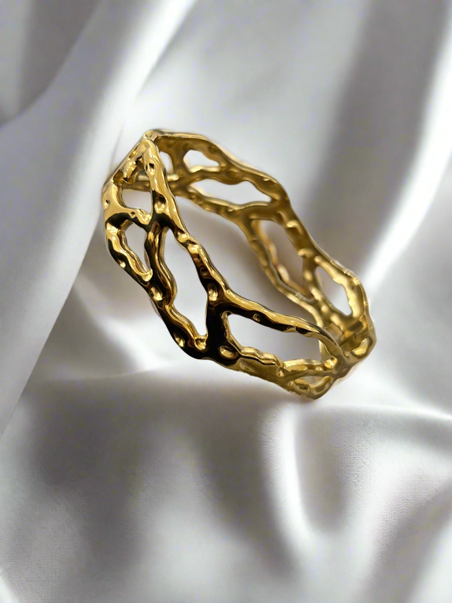 Bold, fluid, untamed. The Molten Flow Bracelet mirrors the raw beauty of molten gold in motion, with sculptural curves that celebrate strength, art, and individuality. A statement piece born from fire and freedom.