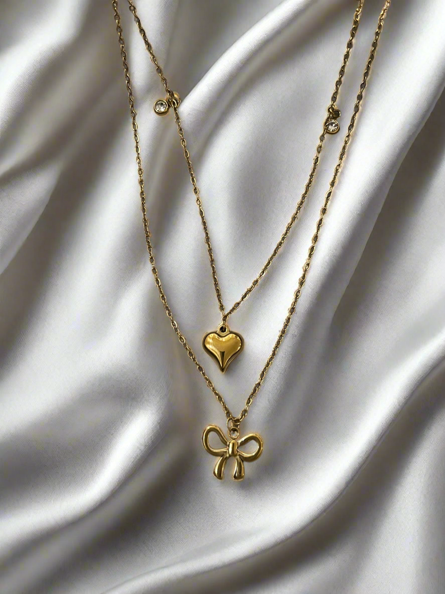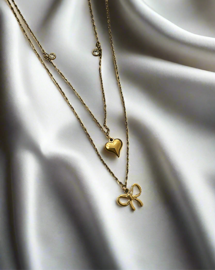Delicate yet full of character, the Charmé Necklace features a graceful double-layered design adorned with a golden heart and a sweet bow pendant. A symbol of love, elegance, and charm – perfect for adding a whimsical touch to any outfit.