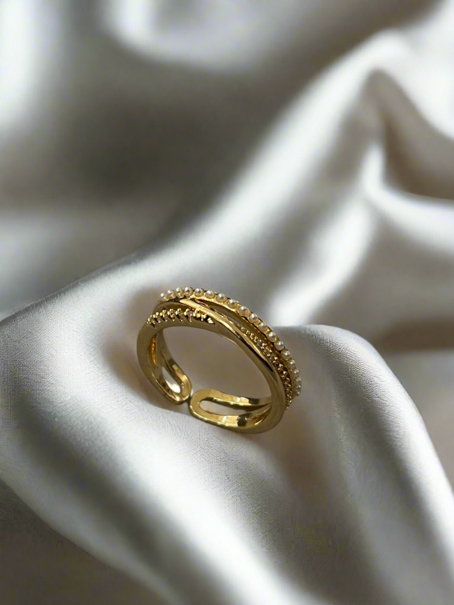 A delicate dance of pearls and gold, the Daisy Loop ring wraps your finger in effortless charm. With its playful curves and dainty detailing, it’s the perfect blend of elegance and whimsy — made to glow with you, every day.