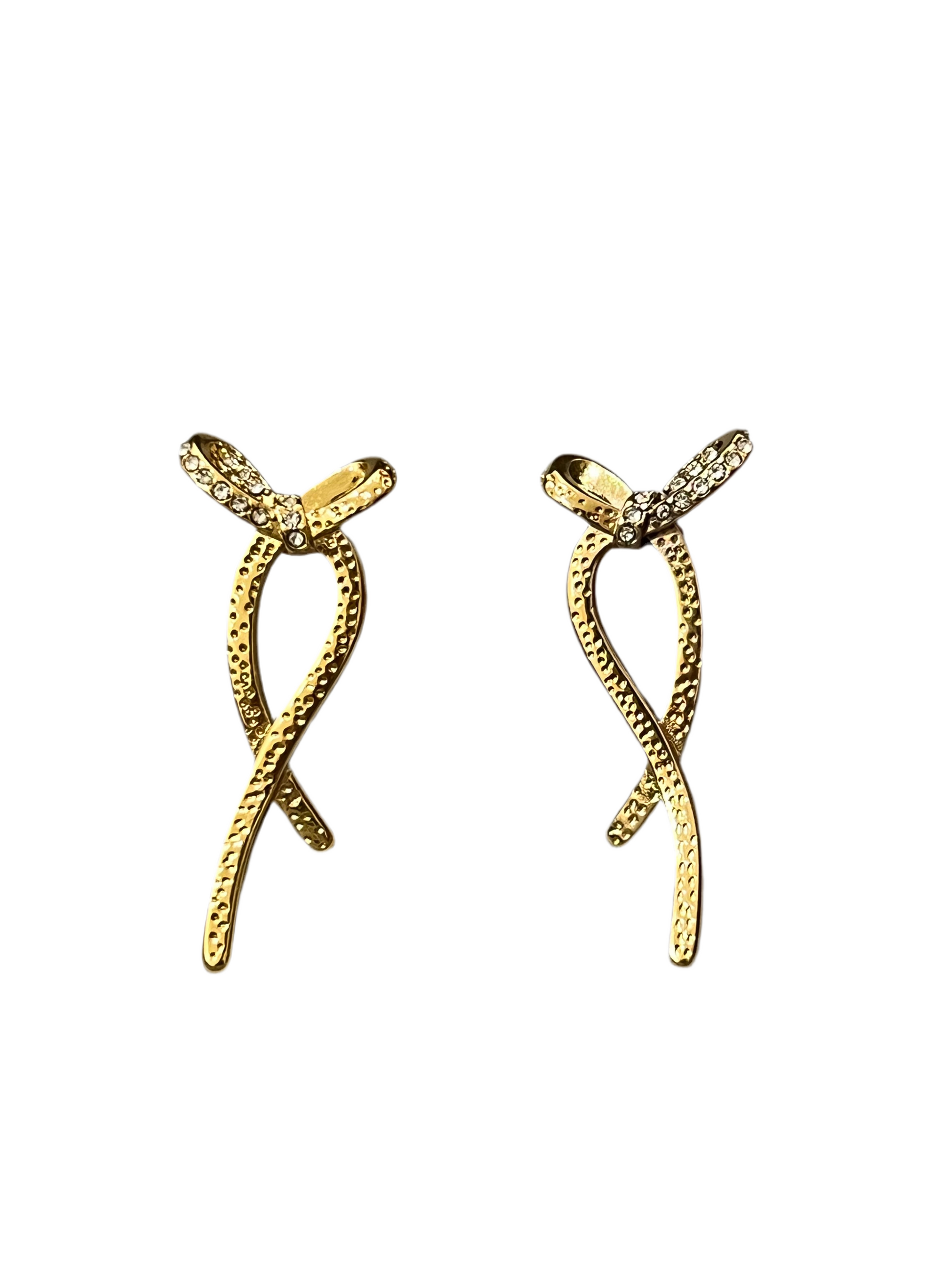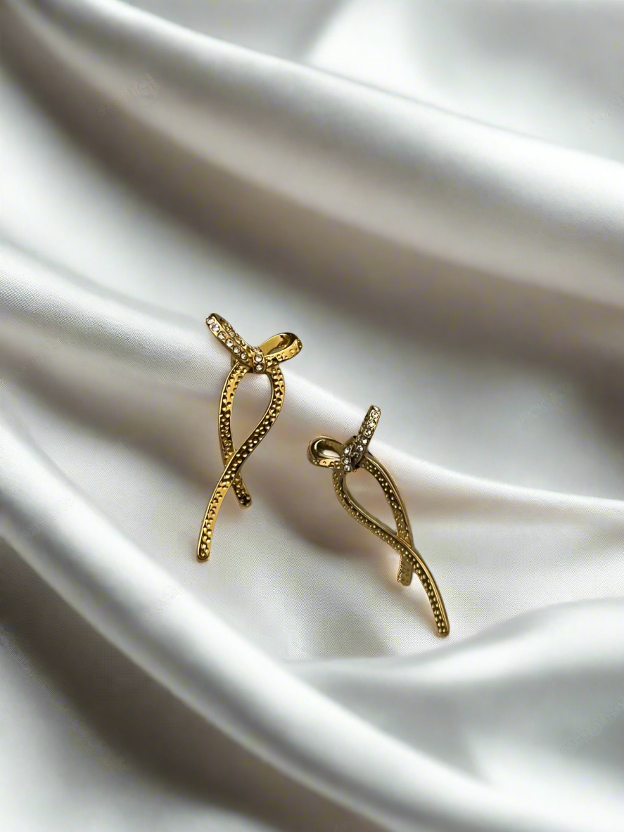 Gracefully sculpted with flowing lines and a crystal-kissed knot, the Élan Bow earrings exude effortless sophistication. A modern take on timeless femininity, they’re designed to move with you — full of charm, elegance, and unmistakable flair.