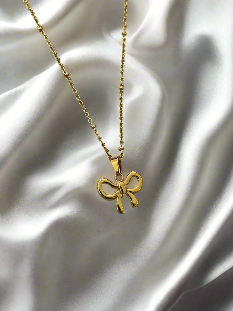 A playful dance of elegance and charm. The Flutter Bow Necklace features a dainty gold bow, crafted to add a touch of whimsy and lightness to your everyday look. Perfect for days when you want to feel a little extra magical.