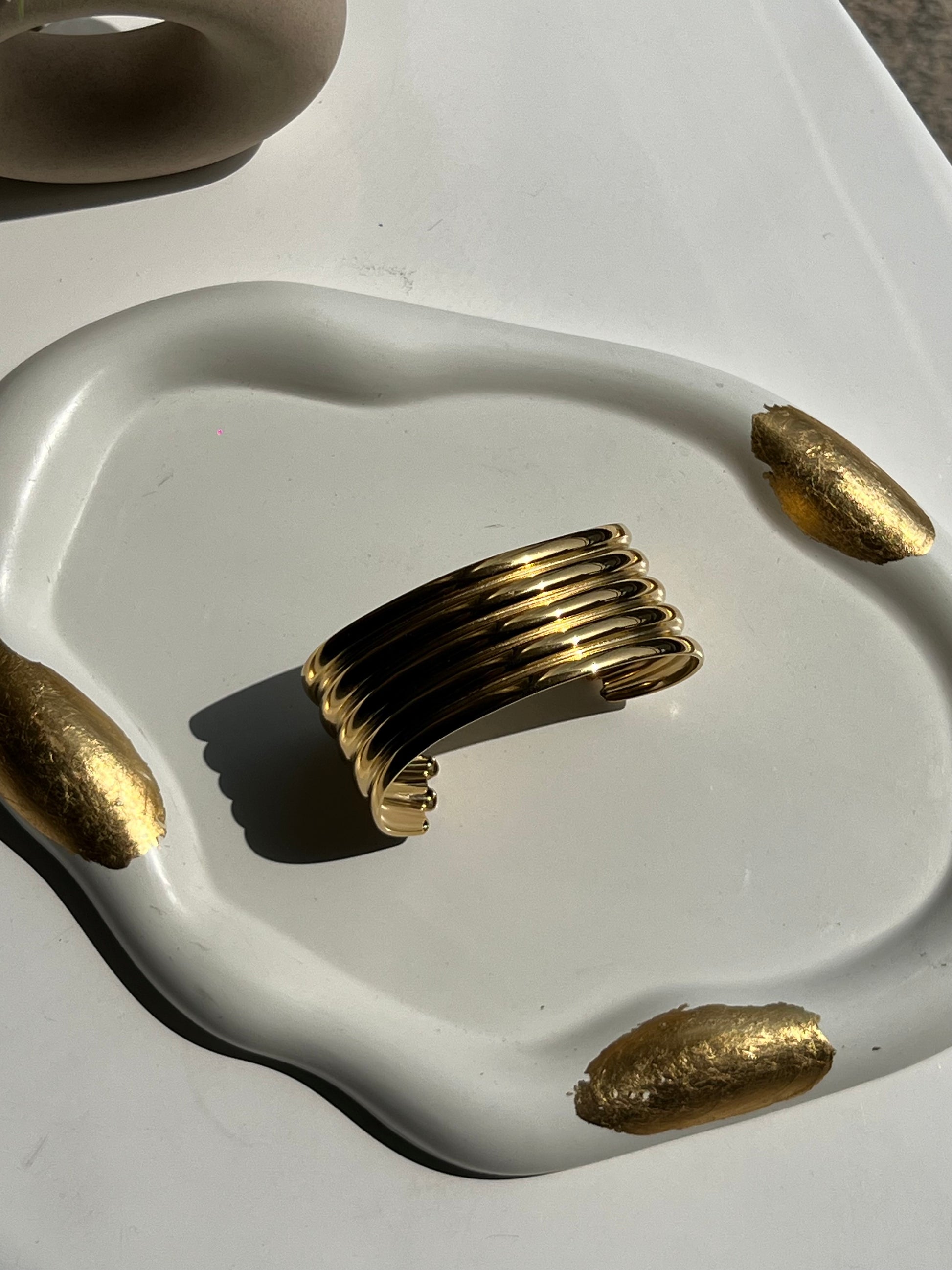 Timeless elegance meets bold design in the Horizon Cuff. This sculptural gold-tone bracelet features sleek, layered bands that wrap effortlessly around your wrist, reflecting light with every movement. A statement piece that embodies modern luxury, perfect for elevating any look.