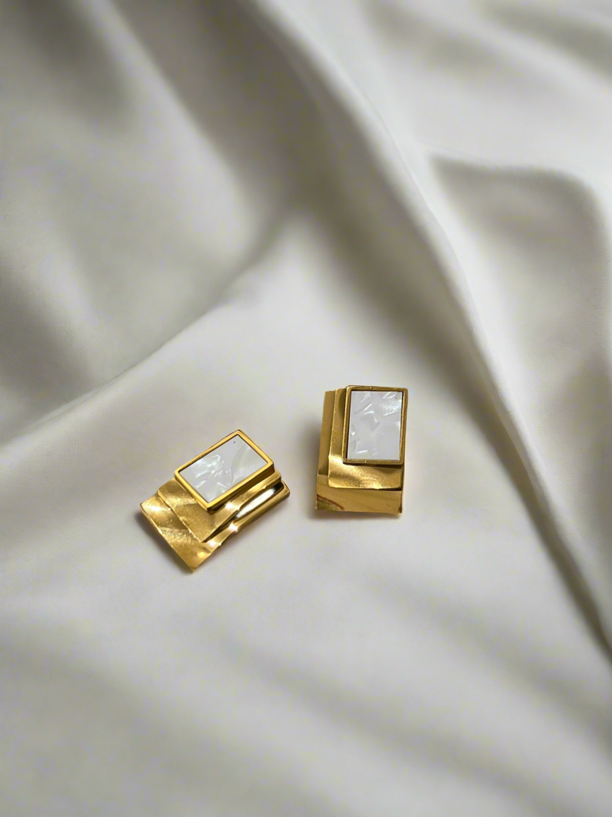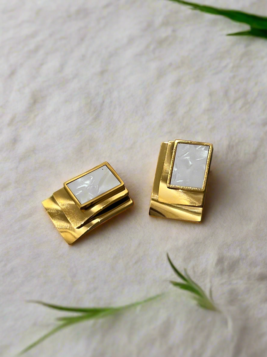 Sculpted elegance meets a soft gleam. With flowing gold and a touch of ivory shine, these earrings redefine modern grace.