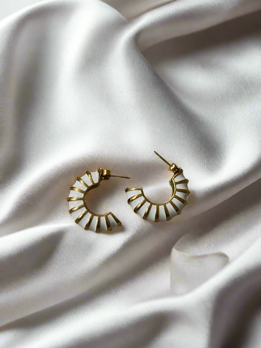 Sweet but never subtle. Sugar Swirl hoops bring a bold twist with creamy white enamel and a gold sculpted spiral that catches the light just right. Dress them up or throw them on with denim — they’re always the main character.