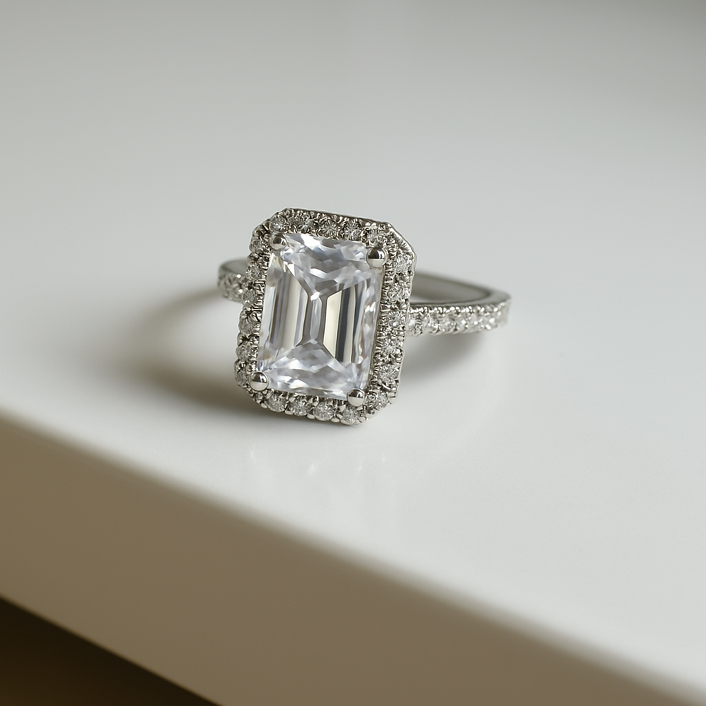 Timelessly bold and endlessly luminous, The Empress- features a captivating emerald-cut center stone framed by a halo of brilliant pavé diamonds. Its clean lines and radiant sparkle exude regal sophistication, designed for the woman who commands every room she enters. A modern heirloom crafted to shine for generations.