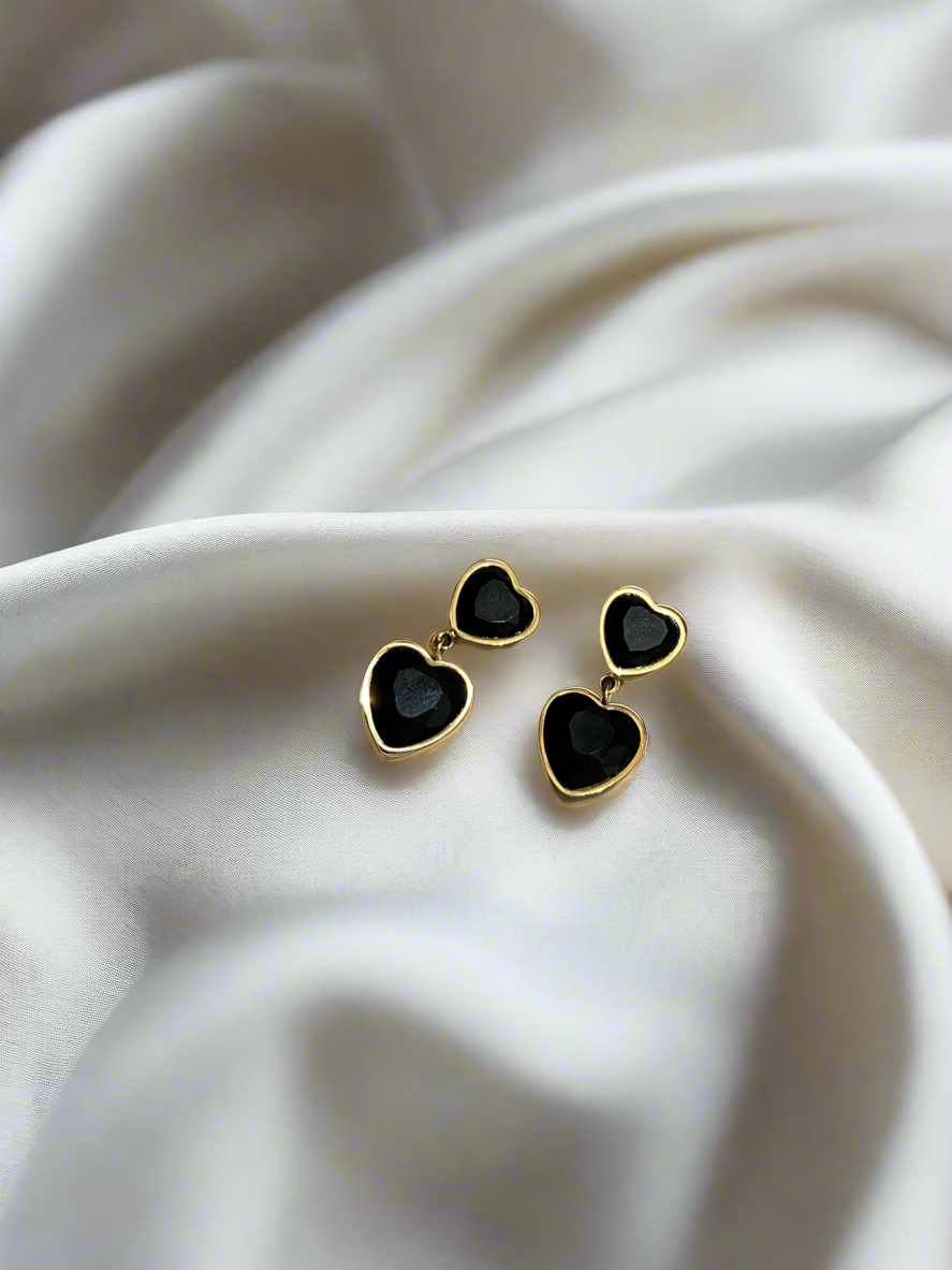 Where dusk meets desire—Twilight Hearts captures the quiet magic of a day’s end. Featuring a duo of heart-shaped drops, one in deep onyx-like enamel and the other in radiant crystal, these earrings evoke the contrast of nightfall and starlight. A graceful blend of mystery and shine, perfect for the romantics who love a little edge.